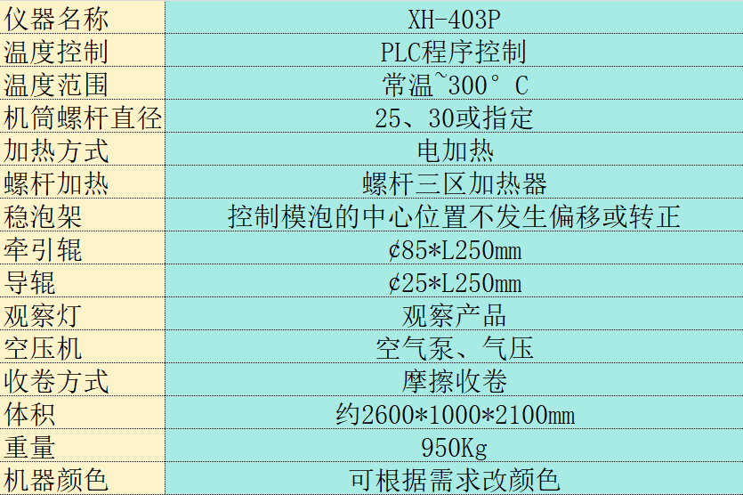 本機主要由主驅動電機、傳動裝置、擠出裝置、加料斗、電控系統、吹膜模頭、壓延組、牽引、收卷等組成。物流從料斗里放入經過擠出裝置的塑化和擠出變為熔融狀態,再從主機經模頭吹塑出來,通過兩輥壓延機進行壓延、牽引、收卷。